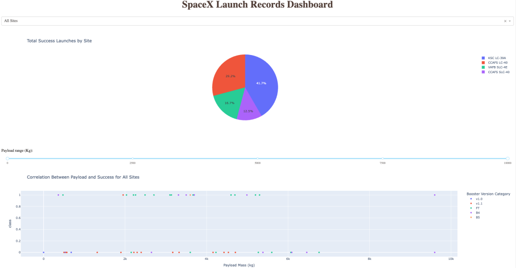 - The dashboard included dropdowns for orbit type and launch site, payload sliders, and updated pie and scatter plots based on inputs.