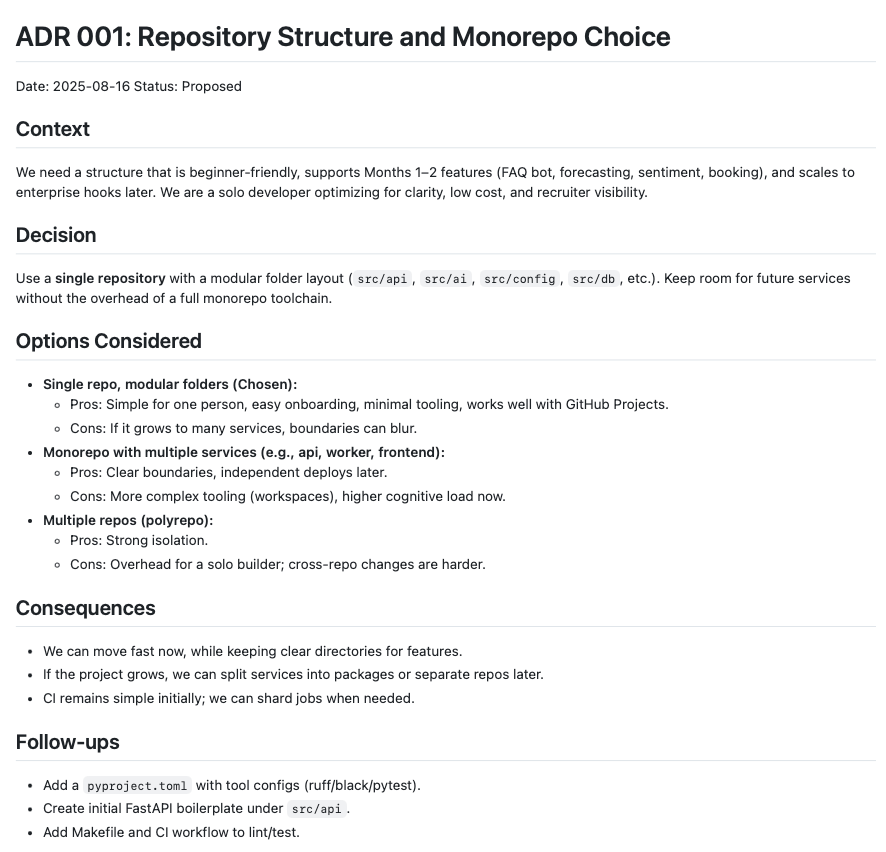 - 001-repo-structure.md → why I chose a single repository with modular folders (instead of polyrepo or heavy monorepo tooling).