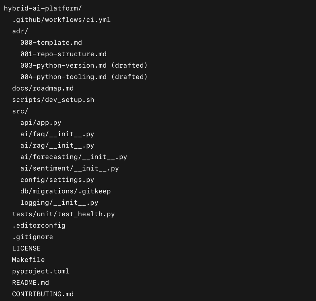 That’s where I’m at after my first week. It’s been intense, but in a good way. I’ve gone from zero repo to a structured, professional foundation that I think could pass as the starting point of an enterprise project. And now, I’m ready to start building features that actually bring this assistant to life.